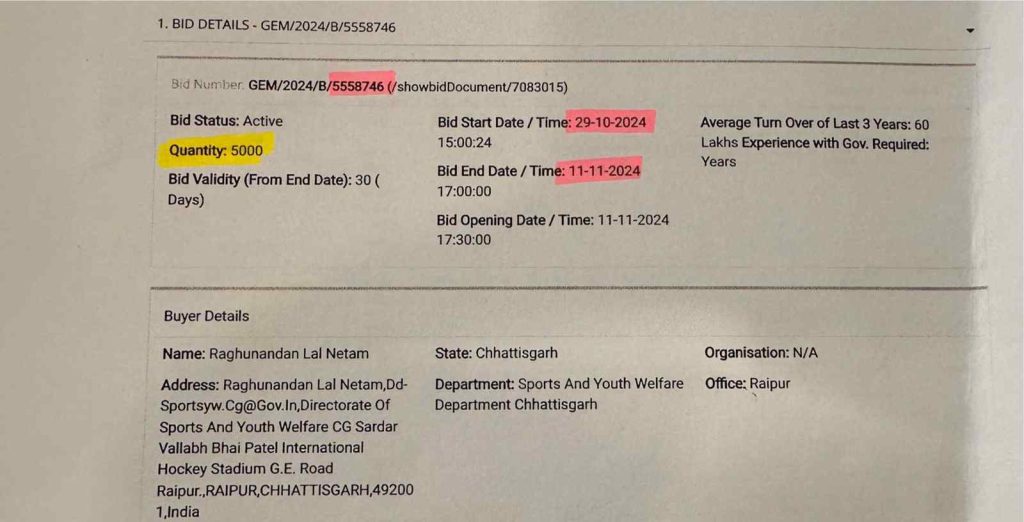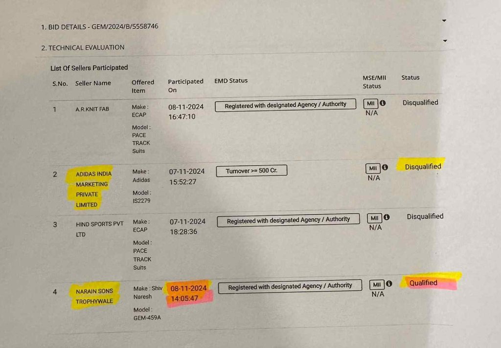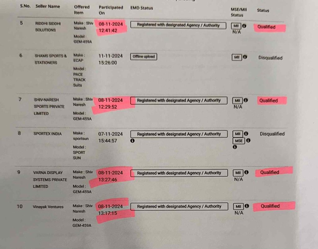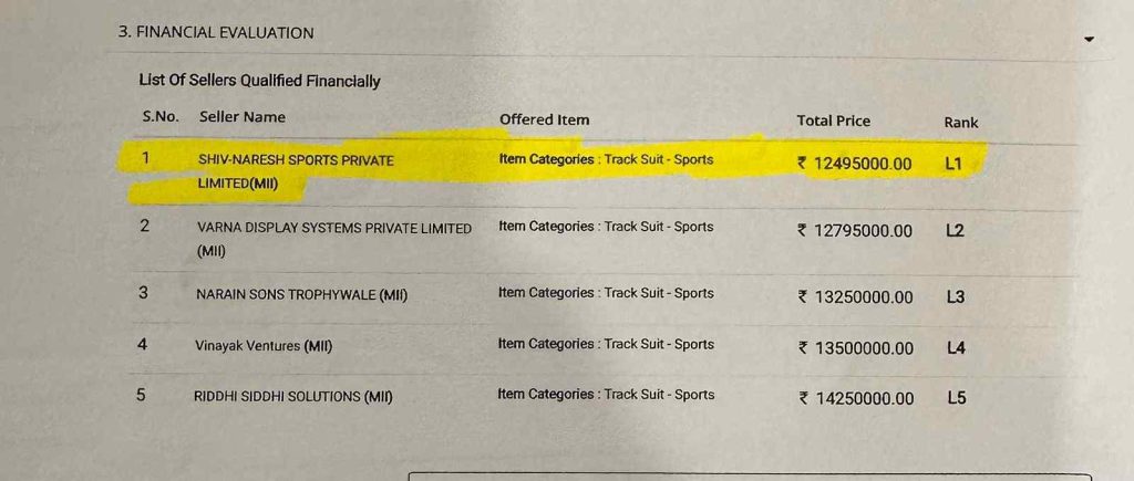 चौंकाने वाली बात यह रही कि टेक्निकल बिड में क्वालीफाई करने वाली कंपनियां एक ही ब्रांड शिव नरेश स्पोर्ट्स प्राइवेट लिमिटेड के उत्पाद से जुड़ी थीं. क्वालिफाई करने वाली सभी पांच कंपनियों ने एक ही ट्रैक सूट मॉडल (आर्टिकल कोड 459A) को अपनी बोली में दर्शाया. पांच कंपनियों में से शिव नरेश स्पोर्ट्स प्राइवेट लिमिटेड को एल-1 घोषित किया गया. कंपनी ने बस्तर ओलंपिक में खिलाड़ियों के लिए 4 हजार 900 ट्रैक सूट की सप्लाई प्रति यूनिट 2499 रुपए की दर पर कर दी.