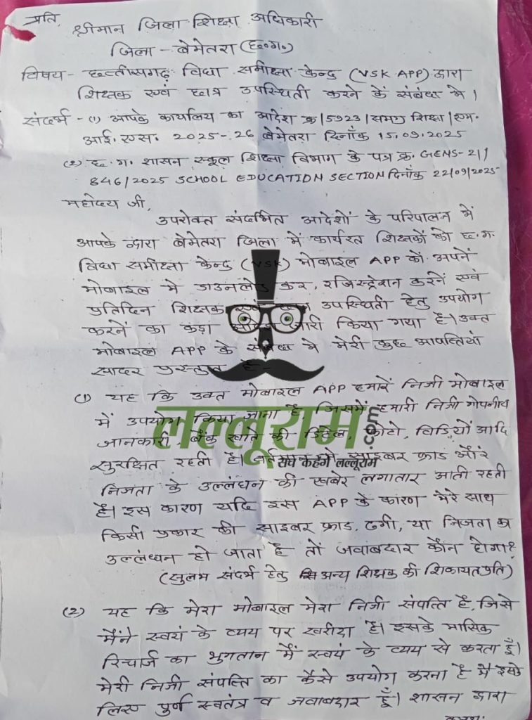 EXCLUSIVE : सत्या राजपूत, रायपुर. छत्तीसगढ़ के बेमेतरा जिले में शासकीय प्राथमिक शाला केछवई के प्रधानपाठक कमलेश सिंह बिसेन ने जिला शिक्षा अधिकारी को एक चेतावनी भरा पत्र लिखकर छत्तीसगढ़ विद्या समीक्षा केंद्र (VSK) मोबाइल ऐप के उपयोग पर कड़ा ऐतराज जताया है. पत्र में उन्होंने निजता के उल्लंघन, साइबर फ्रॉड के खतरे और निजी मोबाइल के दुरुपयोग का मुद्दा उठाते हुए विभाग से जवाब मांगा है.