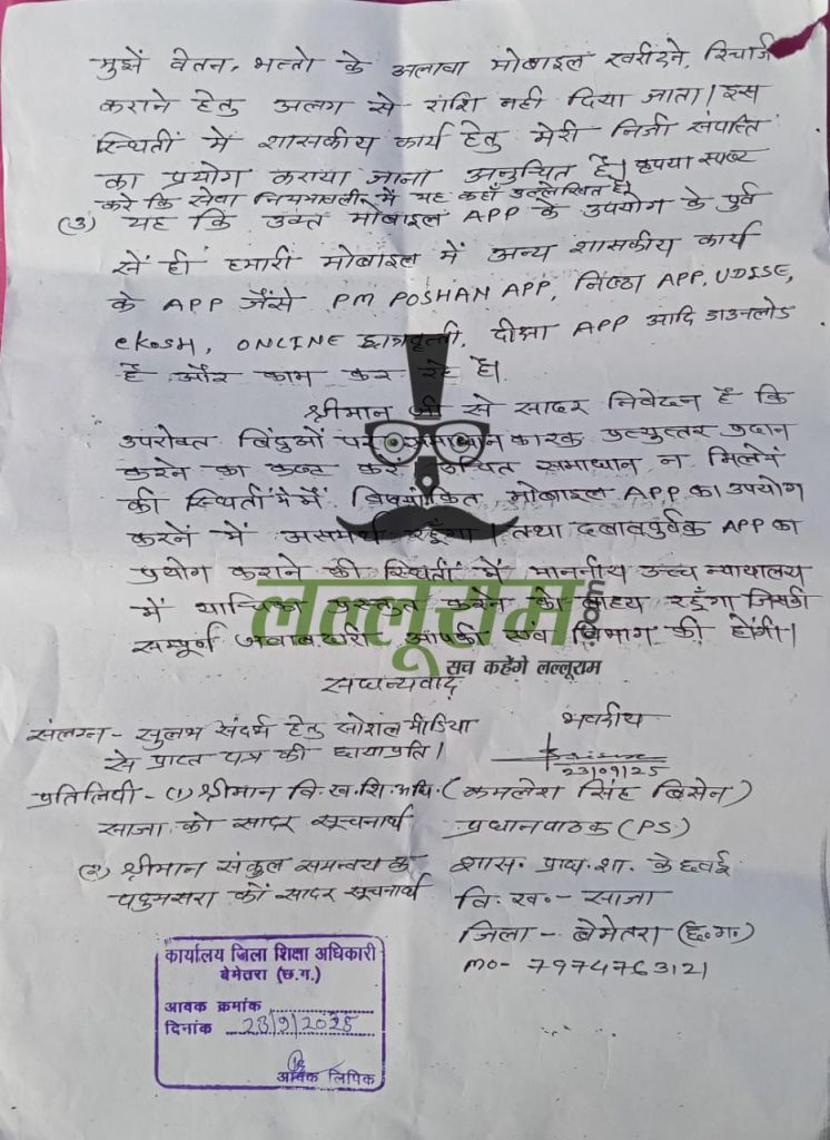 उन्होंने यह भी तर्क दिया कि उनका मोबाइल निजी संपत्ति है, जिसे उन्होंने अपने खर्चे से खरीदा और रिचार्ज कराया है. शासकीय कार्यों के लिए निजी मोबाइल के उपयोग को उन्होंने अनुचित बताते हुए पूछा कि सेवा नियमावली में इसका उल्लेख कहां है? इसके अलावा, उनके मोबाइल में पहले से ही PM POSHAN, निष्ठा, UDSSE, दीक्षा जैसे कई शासकीय ऐप्स डाउनलोड हैं, जिससे अतिरिक्त बोझ बढ़ रहा है.
