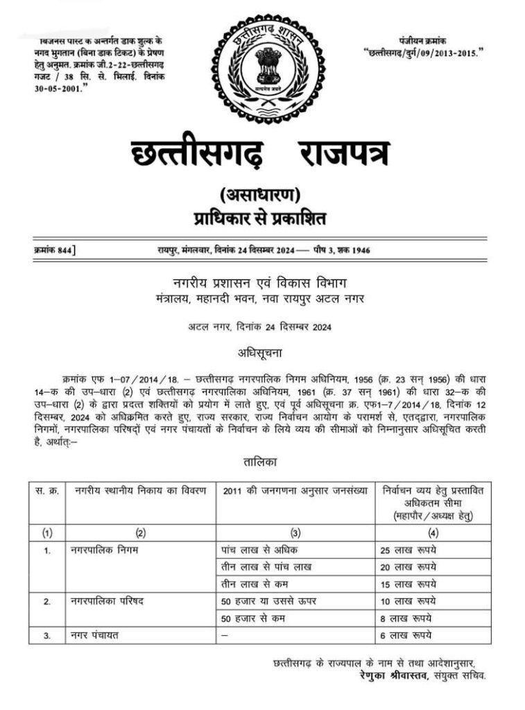 सत्यपाल सिंह राजपूत, रायपुर। नगरीय निकायों की चुनाव की तैयारी अब अंतिम चरण में है. इस कड़ी में नगरीय प्रशासन एवं विकास विभाग मंत्रालय ने अधिसूचना जारी कर नगर पालिका निगम, नगर पालिका परिषद और नगर पंचायतों में महापौर / अध्यक्ष पद के प्रत्याशियों के लिए खर्च की अधिकतम सीमा तय कर दी है. यह भी पढ़ें : Big Breaking : मुख्यमंत्री विष्णु देव साय के निर्देश पर गृह मंत्री विजय शर्मा ने रद्द की राजनांदगांव पुलिस भर्ती प्रक्रिया…