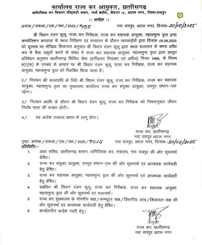 रायपुर। स्थल निरीक्षण एवं सत्यापन के दौरान व्यवसाइयों से अवैध वसूली की शिकायत पर वाणिज्यिक कर विभाग में पदस्थ निरीक्षक विधान रंजन कुलू को राज्य कर आयुक्त ने तत्काल प्रभाव से निलंबित कर दिया है.
