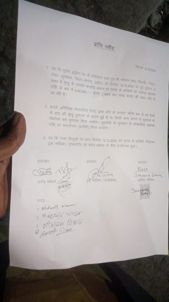 घटना से आक्रोशित परिजन और वाहन चालक संघ ने देर रात तक फैक्ट्री के बाहर शव को रखकर प्रदर्शन किया. श्री सीमेंट प्रबंधन से मुआवजे के साथ मृतक के परिजनों को नौकरी देने की मांग की जा रही थी. जिसके बाद वाहन चालक संघ पदाधिकारी, परिजन और श्री सीमेंट प्रबंधन, ट्रांसपोर्ट यूनियन के बीच देर रात समझौता हुआ. परिजनों को नगद चार लाख रुपए की सहायता राशि दी गई. साथ ही पोस्टमार्टम रिपोर्ट में मृत्यु का कारण दुर्घटना आने पर 4 लाख नगद के अलावा और सहायता राशि दी जाने पर समझौते के बाद प्रदर्शन खत्म किया गया. वहीं सुहेला पुलिस मामला दर्ज कर आगे की कार्रवाई में जुट गई हैं.