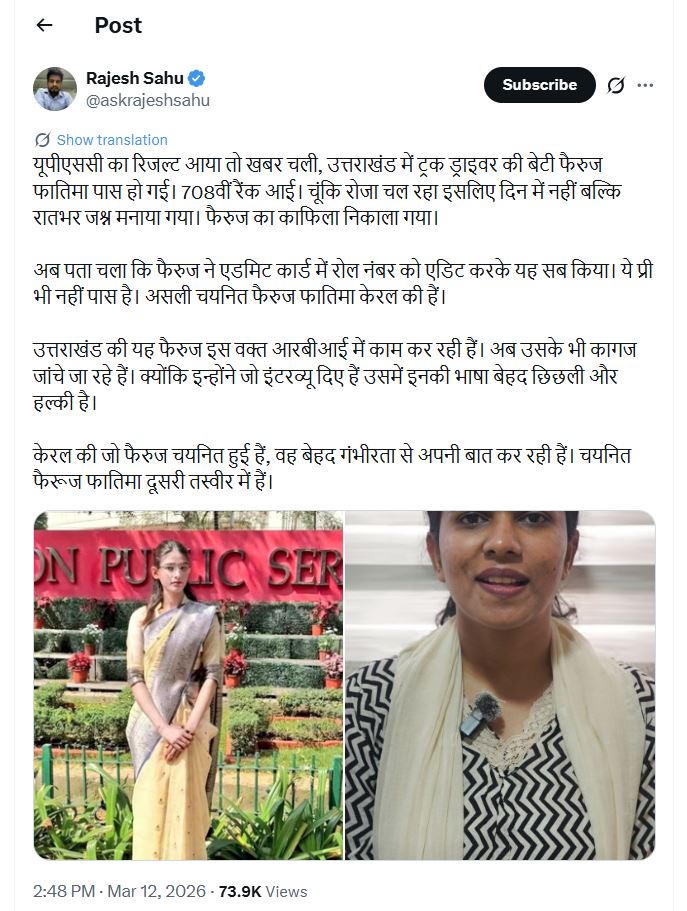 यूपीएससी का रिजल्ट (UPSC Result) आया तो खबर चली कि उत्तराखंड में ट्रक ड्राइवर की बेटी फैरुज फातिमा पास हो गई. 708वीं रैंक आई है. चूंकि रोजा चल रहा था इसलिए दिन में नहीं बल्कि रातभर जश्न मनाया गया. फैरुज का काफिला निकाला गया. लेकिन सच कुछ और ही था. सोशल मीडिया पर इसे लेकर चर्चा चल रही है.