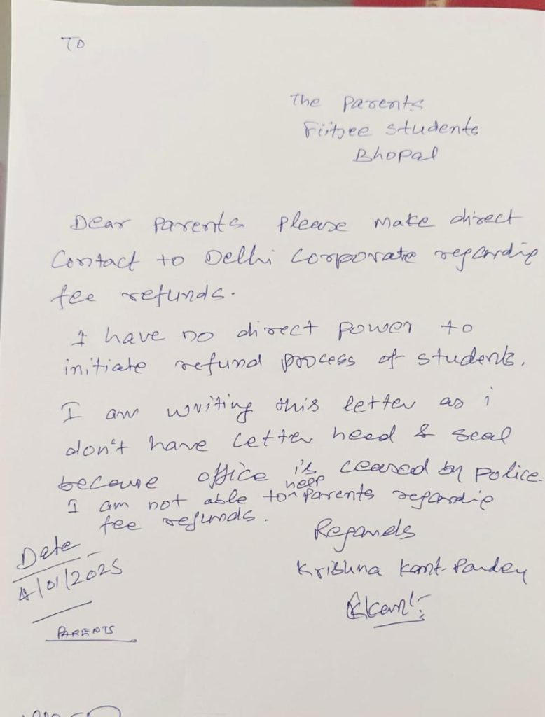 जारी लेटर में यह लिखा गया है कि फीस रिफंड करना उनके हाथ में नहीं है। यह पत्र एक सादे कागज पर लिखा है, जिसमें इसके पीछे का कारण लेटर हेड न होना बताया जा रहा है। जानकारी के मुताबिक सिर्फ भोपाल सेंटर में ही अभिभावकों के कराड़ों रुपए अटके हुए हैं। इस मामले में पेरेंट्स पुलिस से लेकर कलेक्टर तक को शिकायत कर चुके हैं।