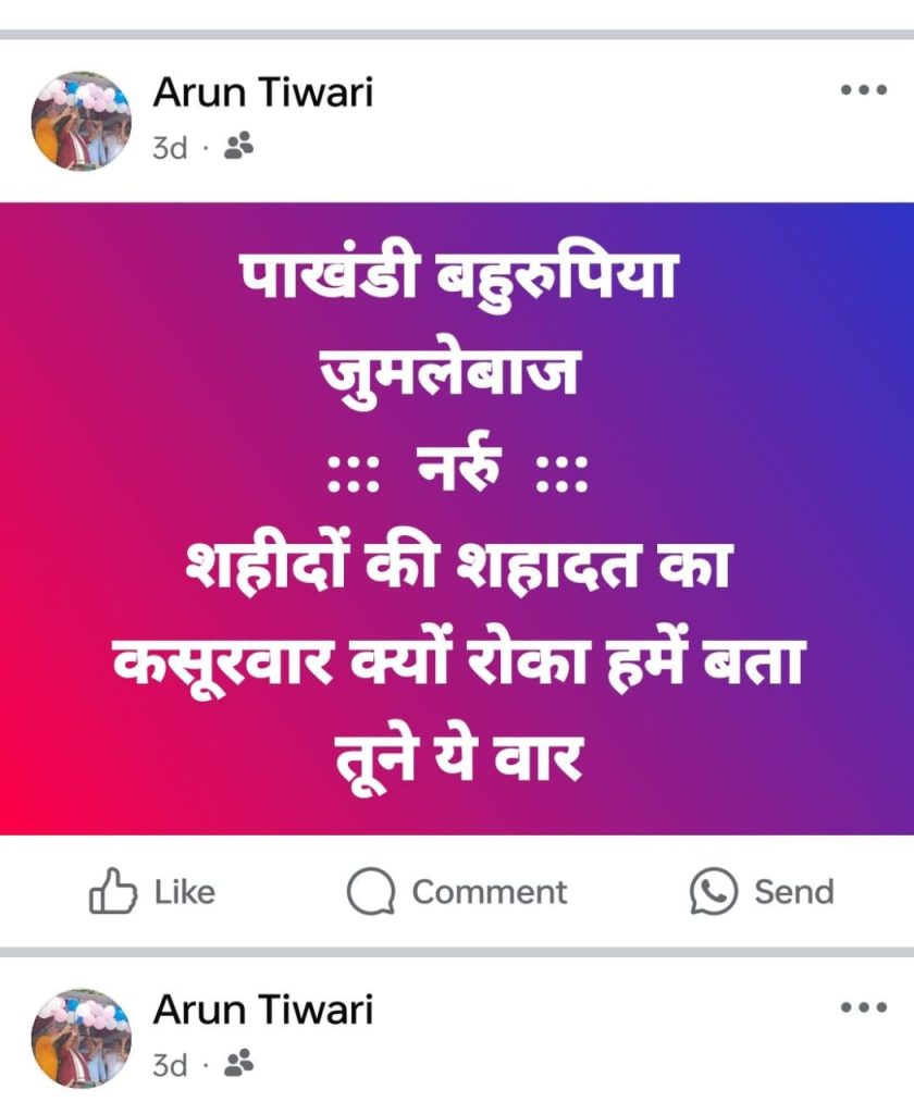जानकारी के अनुसार, बिलासपुर जिले के सीपत विधानसभा क्षेत्र से पूर्व विधायक अरुण तिवारी ने ऑपरेशन सिंदूर को लेकर प्रधानमंत्री नरेंद्र मोदी के खिलाफ सोशल मीडिया पर आपत्तिजनक भाषा का प्रयोग करते हुए एक पोस्ट शेयर किया था. यह पोस्ट होते ही बवाल मचा दिया. पोस्ट वायरल होने के बाद पन्ना नगर निवासी रंजीत यादव ने बिलासपुर के सिविल लाइन थाने में इसकी शिकायत दर्ज कराई.