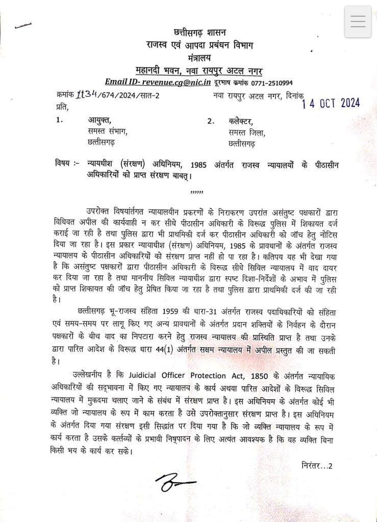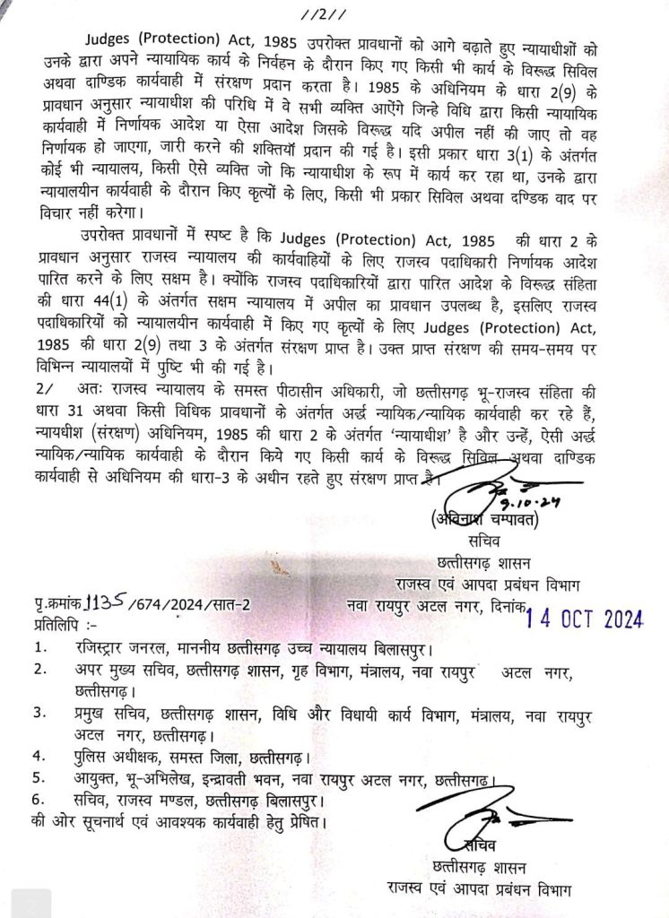राजस्व विभाग के सचिव अविनाश चम्पावत की ओर से जारी पत्र में कहा गया है कि न्यायालयीन प्रकरणों के निराकरण उपरांत असंतुष्ट पक्षकारों द्वारा विधिवत अपील की कार्यवाही न कर सीधे पीठासीन अधिकारी के विरूद्ध पुलिस में शिकायत दर्ज कराई जा रही है, और पुलिस भी प्राथमिकी दर्ज कर पीठासीन अधिकारी को नोटिस दे रही है. इस प्रकार न्यायाधीश (संरक्षण) अधिनियम, 1985 के प्रावधानों के अंतर्गत राजस्व न्यायालय के पीठासीन अधिकारियों को संरक्षण प्राप्त नहीं हो पा रहा है.