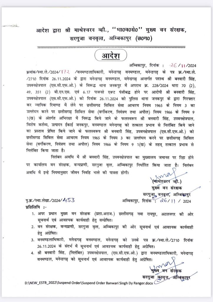 सत्या राजपूत, रायपुर। छत्तीसगढ़ के मनेंद्रगढ़ जिले में नाबालिग से गैंगरेप मामले में 4 आरोपी सरकारी कर्मचारियों की गिरफ्तारी कर ली गई है और आगे की कार्रवाई जारी है. आरोपियों की गिरफ्तारी के बाद अब वन विभाग ने एक बड़ी कार्रवाई की है. विभाग ने उप वन क्षेत्रपाल बनवारी सिंह को निलंबित कर दिया है. आरोपी जनकपुर वन मंडल मनेंद्रगढ़ में पदस्थ था. यह निलंबन आदेश मुख्य वन संरक्षक सरगुजा वनवृत्त अंबिकापुर से जारी हुआ है.