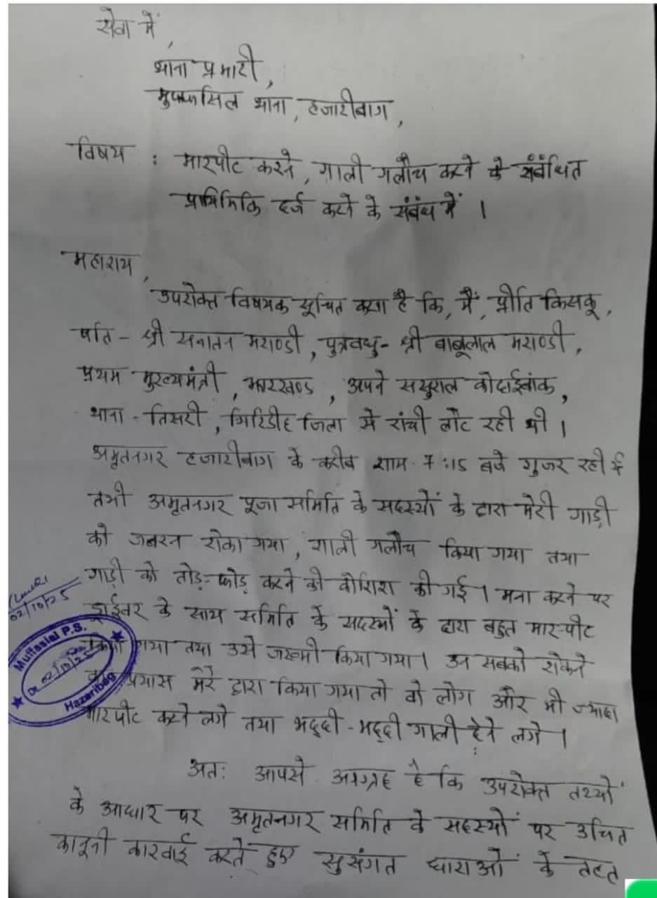झारखंड विधानसभा में नेता प्रतिपक्ष बाबूलाल मरांडी की पुत्रवधू प्रीति किस्को और उनके ड्राइवर के साथ हजारीबाग जिले के अमृत नगर पूजा पंडाल के पास मारपीट और बदसलूकी का मामला सामने आया है। यह विवाद तब हुआ जब दुर्गा पूजा विसर्जन जुलूस के दौरान उनकी गाड़ी जाम में फस गई और कुछ लोगों ने ड्राइवर को बुरी तरह पीटकर घायल कर दिया। इस दौरान बीच-बचाव करने उतरी प्रीति किस्को के साथ भी गाली-गलौज व बदसलूकी की गई। इस घटना पर पीड़िता ने बयान दर्ज कराया, जिसके आधार पर पूरे पूजा समिति के खिलाफ एफआईआर हुई है। फिलहाल पुलिस जांच में जुटी है, लेकिन बाबूलाल मरांडी के परिवार से जुड़े होने के कारण मामले ने राजनीतिक रंग भी लेना शुरू कर दिया है।