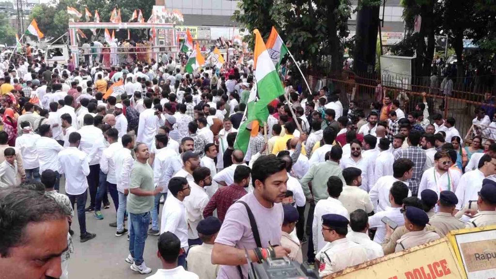 रायपुर. रायपुर दक्षिण विधानसभा उपचुनाव के लिए कांग्रेस प्रत्याशी आकाश शर्मा ने आज नामांकन भरा. शर्मा की नामांकन रैली के बहाने कांग्रेस ने अपनी ताकत दिखाई. रैली में पूर्व सीएम भूपेश बघेल, कांग्रेस अध्यक्ष दीपक बैज, नेता प्रतिपक्ष चरणदास महंत समेत कई दिग्गज नेता और बड़ी संख्या में कांग्रेसी शामिल हुए. नामांकन रैली से पहले गांधी मैदान में कांग्रेस की सभा हुई, जिसमें पूर्व सीएम भूपेश बघेल ने भाजपा सरकार पर हमला बोला.