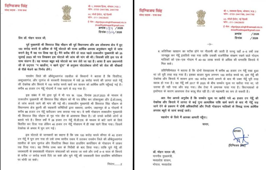 दिग्विजय सिंह ने पत्र में लिखा कि जुलाई 2023 में भी तत्कालीन मुख्यमंत्री शिवराज सिंह चौहान को पत्र लिखा था। उम्मीद है कि न खाऊंगा न खाने दूंगा के अनुरूप घोटालेबाजों को जेल की सलाखों के पीछे भेजा जाएगा। पत्र में दिग्गी ने बताया कि दिवटिका, अब्दुल्लागंज और नूरगंज के सरकारी वेयरहाउस में रखे 35 करोड़ रुपये की लागत वाले गेहूं की देखरेख और किराये में 150 करोड़ रुपये खर्च कर शासन को आर्थिक हानि पहुंचाई गई है।