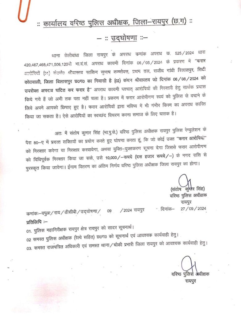 शिवम मिश्रा, रायपुर। कांग्रेस की सरकार के दौरान पूर्व सीएम भूपेश बघेल के करीबी रहे केके श्रीवास्तव को पुलिस ने भगोड़ा घोषित कर दिया है। केके श्रीवास्तव पर 15 करोड़ की ठगी का आरोप है और वह लगातार फरार चल रहे है। तेलीबांधा थाना पुलिस लगातार उसकी तलाश कर रही है, लेकिन सफलता नहीं मिली। इस बीच अब पुलिस ने उसकी गिरफ्तारी पर इनाम घोषित किया है। जिसके मुताबिक जो भी केके श्रीवास्तव आरोपी को गिरफ्तार करायेगा उसे दस हज़ार की नगद राशि दी जायेगी।