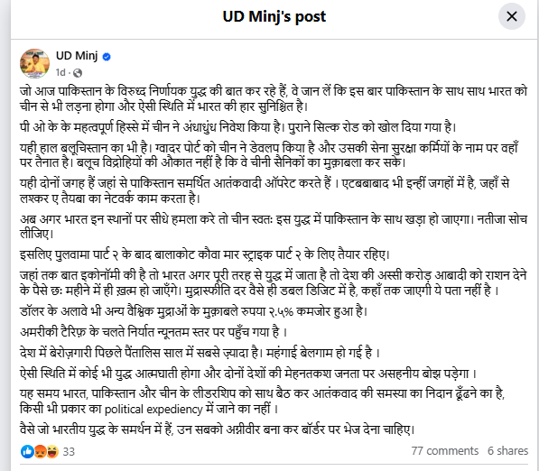 यूडी मिंज ने अपने फेसबुक पोस्ट में लिखा, “जो आज पाकिस्तान के विरुद्ध निर्णायक युद्ध की बात कर रहे हैं, वे जान लें कि इस बार पाकिस्तान के साथ-साथ भारत को चीन से भी लड़ना होगा और ऐसी स्थिति में भारत की हार सुनिश्चित है. पीओके के महत्वपूर्ण हिस्से में चीन ने अंधाधुंध निवेश किया है. पुराने सिल्क रोड को खोल दिया गया है.