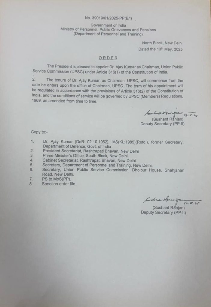पूर्व रक्षा सचिव अजय कुमार (Ajay kumar)को संघ लोक सेवा आयोग (UPSC) का नया अध्यक्ष नियुक्त किया गया है. यह जानकारी केंद्रीय कार्मिक मंत्रालय के एक आदेश में दी गई है. यूपीएससी अध्यक्ष का पद 29 अप्रैल को प्रीति सूदन के कार्यकाल समाप्त होने के बाद से खाली था. मंत्रालय के आदेश के अनुसार, अजय कुमार की नियुक्ति को राष्ट्रपति द्रौपदी मुर्मू ने स्वीकृति दी है. अजय कुमार, जो 1985 बैच के केरल कैडर के रिटायर्ड भारतीय प्रशासनिक सेवा (IAS) अधिकारी हैं, ने 23 अगस्त 2019 से 31 अक्टूबर 2022 तक रक्षा सचिव के रूप में कार्य किया.
