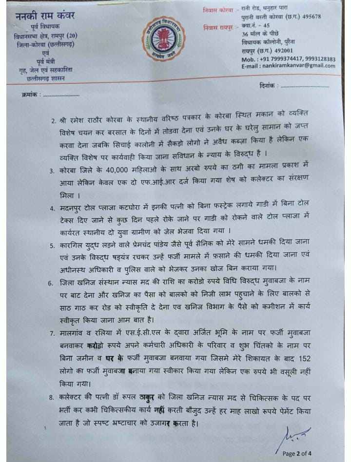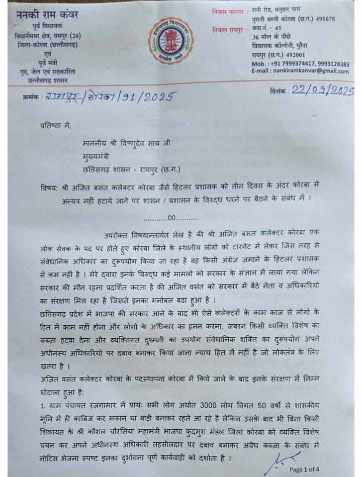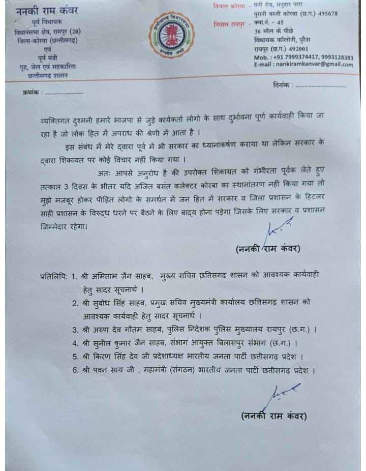 पूर्व गृहमंत्री कंवर ने पत्र में लिखा है कि कोरबा कलेक्टर अजीत बसंत संवैधानिक शक्तियों का दुरूपयोग कर रहे हैं. कलेक्टर उनके समर्थकों के खिलाफ दुर्भाग्यपूर्ण कार्रवाई कर रहे हैं. उन्होंने सीएस, डीजीपी के अलावा प्रदेश भाजपाध्यक्ष किरण देव और महामंत्री (संगठन) पवन साय को भी पत्र भेजकर कलेक्टर के खिलाफ शिकायत की है. ननकीराम ने कलेक्टर बसंत पर डीएमएफ की राशि में गड़बड़ी का भी आरोप लगाया है. उन्होंने कहा है कि तीन दिन के भीतर कोरबा कलेक्टर का तबादला नहीं होने पर वे धरने पर बैठने मजबूर होंगे. इसके लिए सरकार और प्रशासन जिम्मेदार होगा.