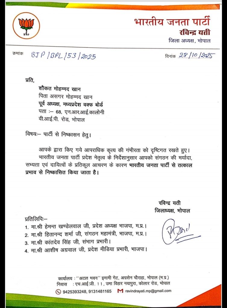 भोपाल बीजेपी जिलाध्यक्ष रविंद्र यती ने शौखत खान को पार्टी से बाहर कर दिया है। उन्होंने आदेश में लिखा- ‘आपके द्वारा किए गये आपराधिक कृत्य की गंभीरता को दृष्टिगत रखते हुए भारतीय जनता पार्टी प्रदेश नेतृत्व के निर्देशानुसार आपको संगठन की मर्यादा, सभ्यता एवं दायित्वों के प्रतिकूल आचरण के कारण भारतीय जनता पार्टी से तत्काल प्रभाव से निष्कासित किया जाता है।’