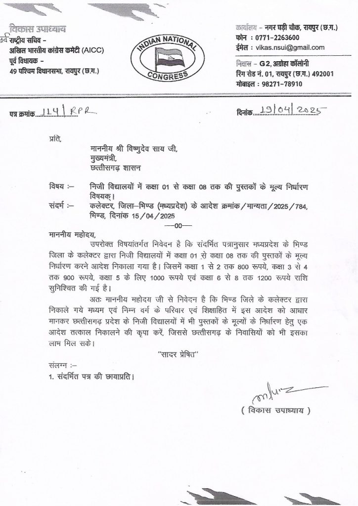 विकास उपाध्याय ने अपने पत्र में लिखा है कि जिस प्रकार हाल ही में मध्यप्रदेश के भिंड जिले के कलेक्टर द्वारा निजी विद्यालयों में कक्षा 1 से कक्षा 8 तक की पुस्तकों के मूल्य निर्धारण के लिए आदेश जारी किया गया है, जिसमें कक्षा 1 से 2 तक ₹800, कक्षा 3 से 4 तक ₹900, कक्षा 5 के लिए ₹1000 एवं कक्षा 6 से 8 तक ₹1200 की राशि सुनिश्चित की गई है, उसी आदेश को आधार मानकर उन्होंने छत्तीसगढ़ में भी निजी स्कूलों की पुस्तकों के मूल्य निर्धारण के लिए राज्य के मुखिया से निवेदन किया है.