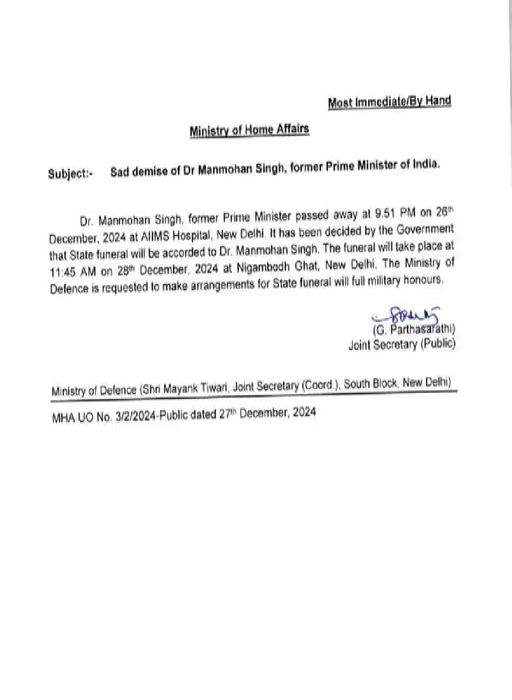पूर्व प्रधानमंत्री डॉ. मनमोहन सिंह का गुरुवार रात निधन हो गया था. वे 92 साल के थे. मनमोहन लंबे समय से बीमार थे. घर पर बेहोश होने के बाद उन्हें रात 8:06 बजे दिल्ली AIIMS लाया गया था. हॉस्पिटल बुलेटिन के मुताबिक, रात 9:51 बजे उन्होंने आखिरी सांस ली.