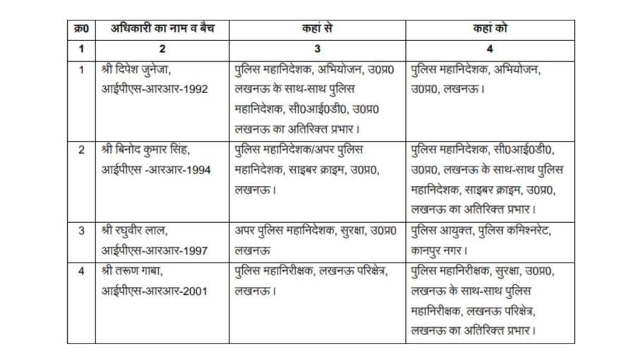 लखनऊ. उत्तर प्रदेश में आईपीएस अफसरों का ट्रांसफर कर दिया गया है. जारी आदेश में 4 भारतीय पुलिस सेवा के अधिकारियों का नाम शामिल है. इनमें दीपेश जुनेजा, विनोद कुमार सिंह, रघुवीर लाल और तरुण गाबा शामिल हैं.