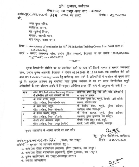 नवा रायपुर। छत्तीसगढ़ पुलिस मुख्यालय ने 48वें आईपीएस इंडक्शन ट्रेनिंग कोर्स के लिए राज्य के 4 एसपी के नामांकन को लेकर प्रस्ताव शासन को भेजा है। यह प्रशिक्षण 6 अप्रैल 2026 से 15 मई 2026 तक सरदार वल्लभभाई पटेल राष्ट्रीय पुलिस अकादमी, हैदराबाद में आयोजित किया जाएगा। इस प्रशिक्षण में शामिल होने के लिए राज्य के जिन 4 पुलिस अधीक्षकों का चयन किया गया है। इनमें जांजगीर-चांपा के एसपी विजय पाण्डेय, कोण्डागांव के एसपी पंकज चन्द्रा, गरियाबंद के एसपी वेदव्रत सिरमौर और रायपुर (ग्रामीण) की एसपी श्वेता श्रीवास्तव शामिल हैं।