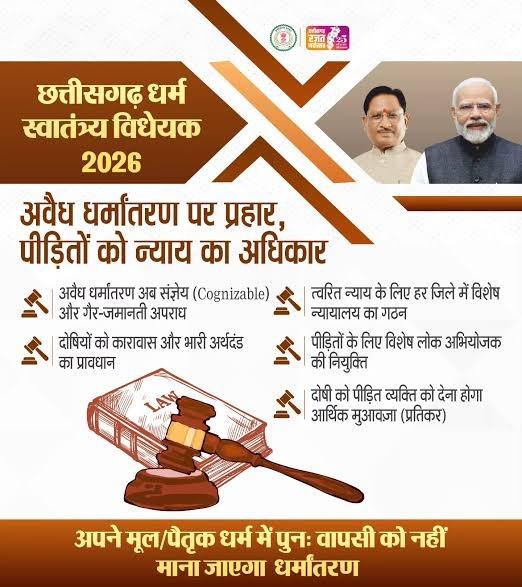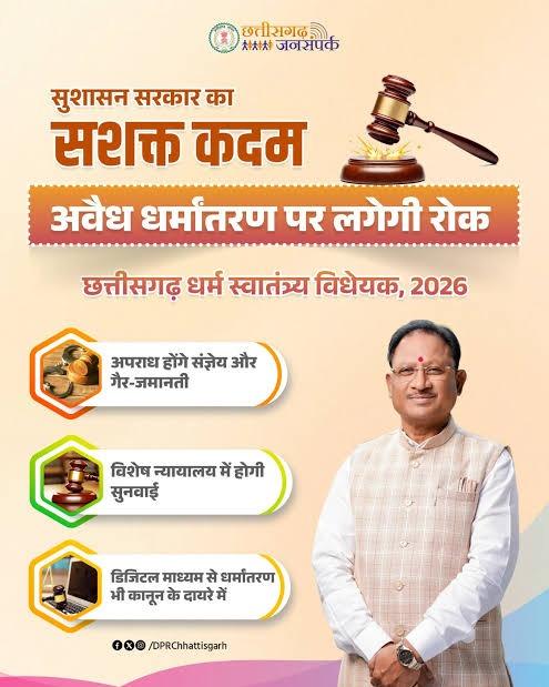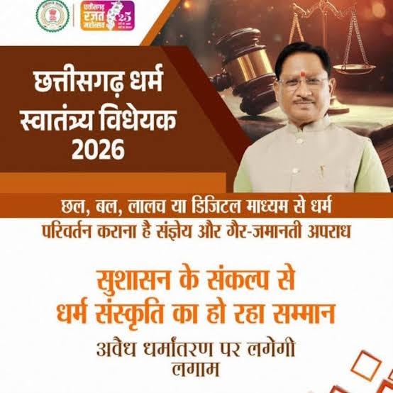 रायपुर। विविधताओं से भरे भारत देश की सबसे बड़ी शक्ति है धर्म, संस्कृति और परंपराओं की बहुलता। ऐसी दशा में जब किसी राज्य में धार्मिक स्वतंत्रता से जुड़े कानूनों में बड़ा बदलाव होता है तो उसका गहरा प्रभाव समाज, संस्कृति और राजनीति के विभिन्न आयामों पर भी पड़ता है। छत्तीसगढ़ में पारित धर्म स्वातंत्र्य अधिनियम 2026 इसी दिशा में एक महत्वपूर्ण कदम है, जो प्रदेश की सांस्कृतिक पहचान, सामाजिक संरचना और प्रशासनिक व्यवस्था को एक नया रूप दे रहा है।