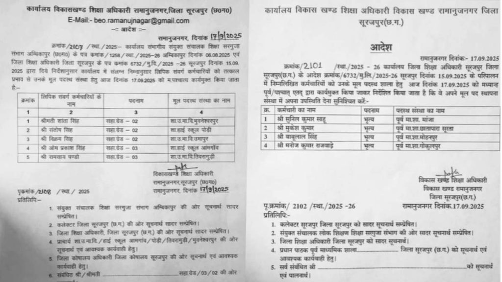 पहले आदेश में सहा ग्रेड -02 कर्मचारी शांता सिंह को उनके मूल संस्था शासकीय उच्चतर माध्यमिक विद्यालय भुवनेश्वरपुर, संतोष सिंह को शासकीय हाई स्कूल पोड़ी, विक्रम सिंह को शासकीय उच्चतर माध्यमिक विद्यालय उमापुर, सहा ग्रेड -03 कर्मचारी ओम प्रकाश सिंह को शासकीय हाई स्कूल आमगाँव और रामसाय पण्डो को शासकीय उच्चतर माध्यमिक विद्यालय तिवरागुड़ी भेजा गया है.