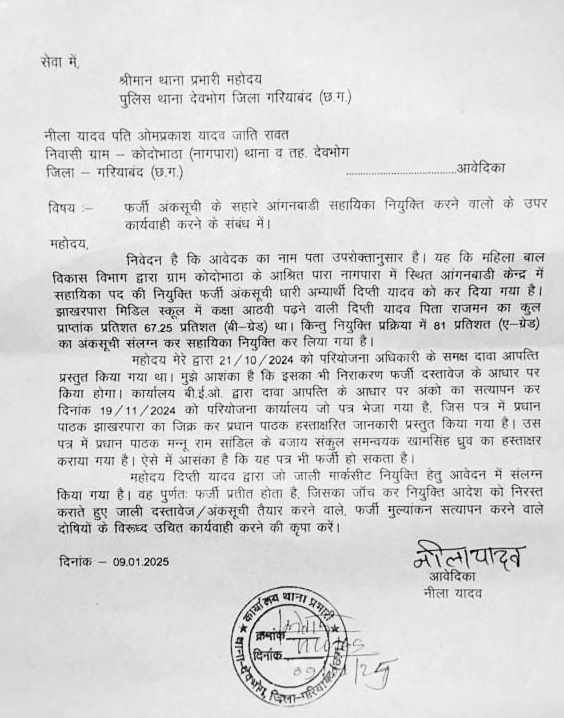 पूंजीपारा आंगनबाड़ी में सहायिका भर्ती में जाली अंक सूची का मामला अभी खत्म नहीं हुआ है कि अब कोदोभाठा के नागपारा में सहायिका भर्ती में गड़बड़ी का मामला सामने आया है. भर्ती प्रकिया में 78 प्रतिशत अंक वाली अभ्यर्थी रही नीला यादव ने 9 जनवरी को थाने पहुंचकर प्रभारी गौतम गावड़े को लिखित शिकायत सौंपा है, जिसमें 67 प्रतिशत अंक पाने वाली दीप्ति यादव की नियुक्ति 81 प्रतिशत अंक वाले जाली अंक सूची के सहारे करने का आरोप लगाया है.