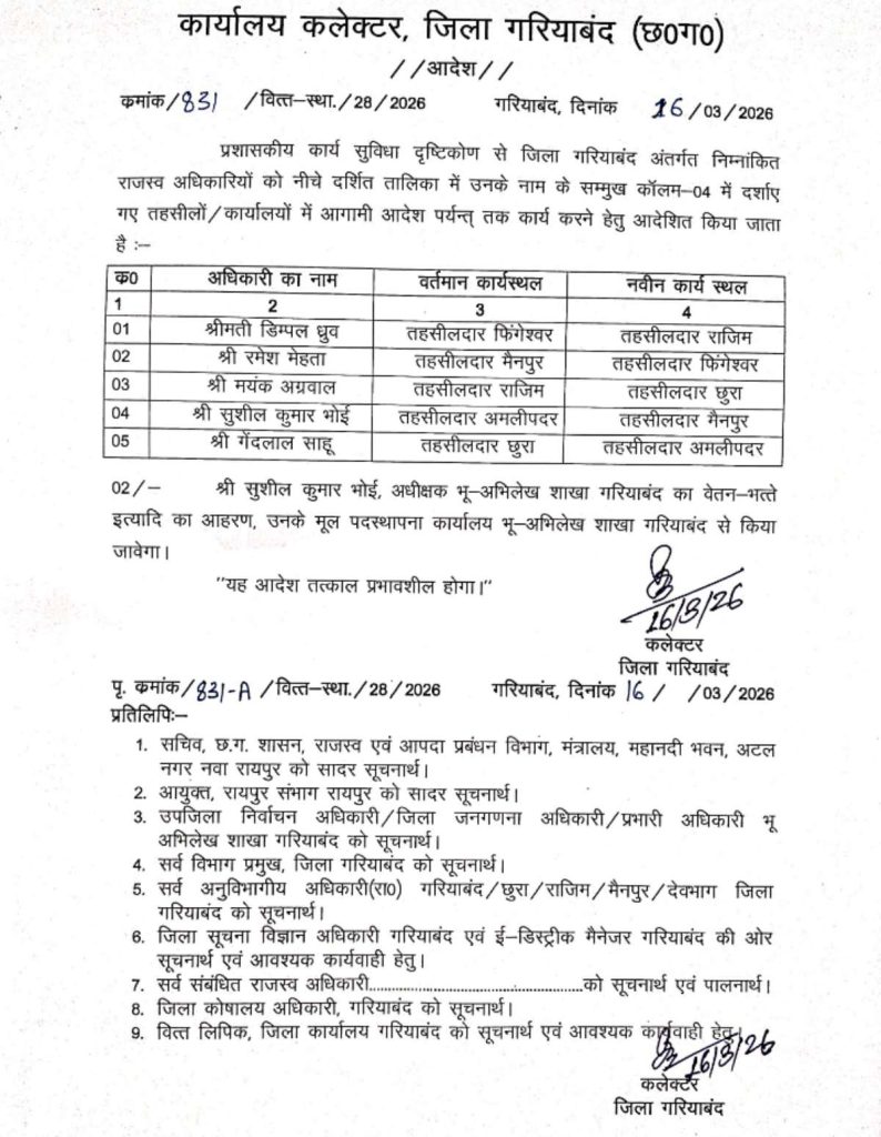 जारी आदेश के अनुसार, वर्तमान में तहसीलदार फिंगेश्वर के पद पर कार्यरत डिम्पल ध्रुव को अब तहसीलदार राजिम के पद पर स्थानांतरित किया गया है। वहीं, तहसीलदार मैनपुर रहे रमेश मेहता को तहसीलदार फिंगेश्वर का कार्यभार सौंपा गया है।