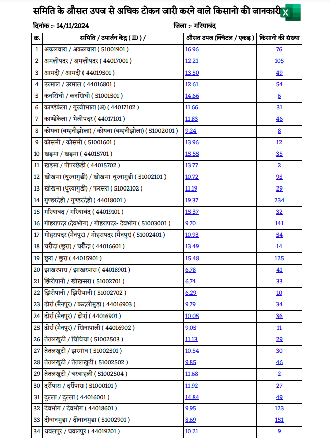पुरुषोत्तम पात्र, गरियाबंद। नई सरकार की नई खरीदी नीति में धान विक्रय के लिए सप्ताह भर पहले से टोकन कटाने का प्रावधान किया गया था। मकसद था काटे गए टोकन का सत्यापन करना। खरीदी शुरू हुए तीन दिन हुए है, इस तीन दिन में काटे गए टोकन का अब सत्यापन शुरू हो गया है। खरीदी पोर्टल में एनआईसी ने ग्राम वार अनावरी रिपोर्ट अपलोड कर दिया है। जिसमें औसत उत्पादन दर्शाया गया है। दर्ज रिपोर्ट के आधार पर जिला प्रशासन ने अब उन टोकन की सूची बना लिया है, जहां उत्पादन की मात्रा से अधिक टोकन काटे गए है। सूची के मुताबिक 69 केंद्र में 3465 टोकन की सूची बनाई गई है जो उत्पादन से ज्यादा मात्रा का टोकन कटाया है। इस सूची का अब सत्यापन होगा।