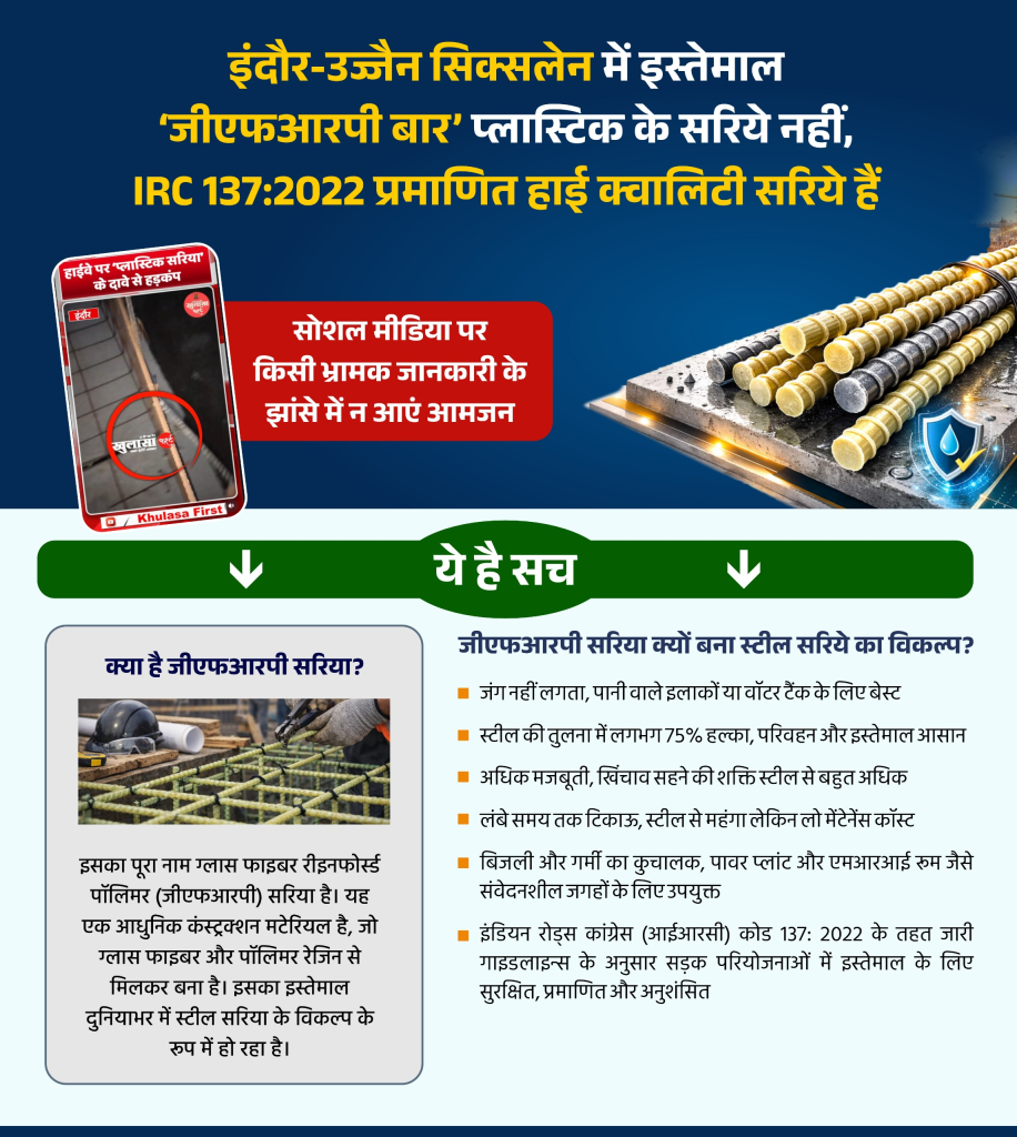 भोपाल। निर्माणाधीन इंदौर-उज्जैन सिक्सलेन मार्ग को लेकर सोशल मीडिया पर एक वीडियो वायरल हुआ, जिसमें आरसीसी ड्रेनेज निर्माण में “प्लास्टिक के सरिये” के उपयोग की भ्रामक जानकारी दी गई। जो पूर्णताः गलत है। दरअसल, इंदौर-उज्जैन सिक्सलेन के निर्माण में आधुनिक तकनीक युक्त जीएफआरपी बार्स (सरिये) का इस्तेमाल किया जा रहा है।
