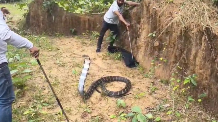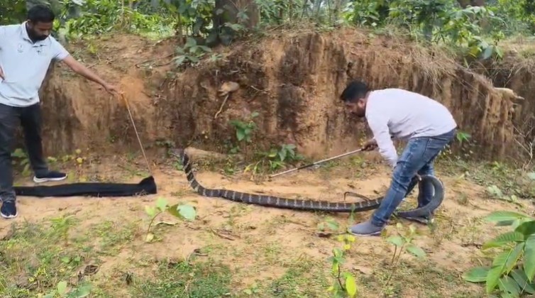 रेस्क्यू के दौरान किंग कोबरा बार-बार फुफकारता रहा और अपना रौद्र रूप दिखाता रहा, जिससे मौके पर मौजूद लोगों की सांसें थम सी गईं। टीम ने पूरी सावधानी और संयम से काम करते हुए आखिरकार सांप को सुरक्षित थैले में डालने में सफलता हासिल की।