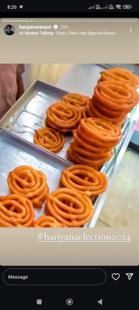 हरियाणा चुनाव में बीजेपी को स्पष्ट बहुमत मिलता देख अभिनेत्री कंगना रनौत ने इंस्टाग्राम की स्टोरी पर जलेबियों की तस्वीर साझा की। उन्होंने इस तस्वीर में एक हैशटैग का भी इस्तेमाल किया है. उन्होंने लिखा- हैशटैग हरियाणा इलेक्शन 2024।