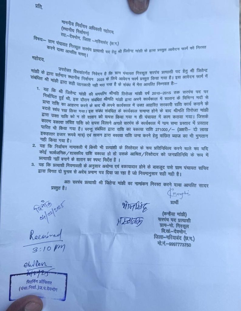 पुरुषोत्तम पात्र, गरियाबंद। बिंद्रानवागढ़ के पूर्व विधायक चरण सिंह मांझी के छोटे सुपुत्र जितेंद्र मांझी ने अपने गृह ग्राम पंचायत गिरशूल से सरपंच पद के लिए नामांकन दाखिल किया है। लेकिन इस नामांकन पर विवाद खड़ा हो गया है। सरपंच पद के एक अन्य उम्मीदवार और अधिवक्ता कन्हैया मांझी ने उनके खिलाफ दावा-आपत्ति दर्ज कराई, जिसमें यह आरोप लगाया गया कि जितेंद्र की पत्नी तिरोजा मांझी के सरपंच कार्यकाल (2010-2015) के दौरान पंचायत पर 2.71 लाख रुपये की बकाया राशि थी, जिसे अब तक जमा नहीं किया गया था।