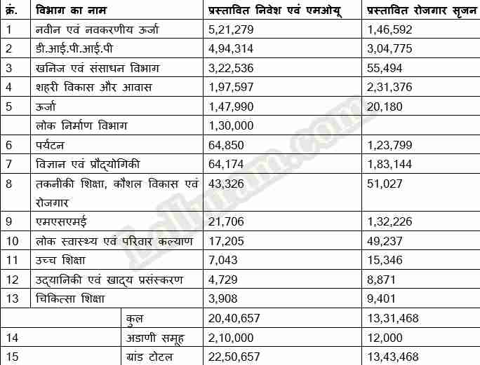 भोपाल के राष्ट्रीय मानव संग्रहालय में शुरू हुई दो दिवसीय ग्लोबल इंवेस्टर्स समिट के काफी सुखद परिणाम आये हैं। समिट के पहले दिन बड़ी संख्या में निवेश के प्रस्ताव मिले। इसमें 22 लाख 50 हजार 657 करोड़ के इंटेशन-टू-इन्वेस्ट, एमओयू और निवेश प्रस्ताव प्राप्त हुए। इससे 13 लाख 43 हजार 468 रोजगार का सृजन होगा।