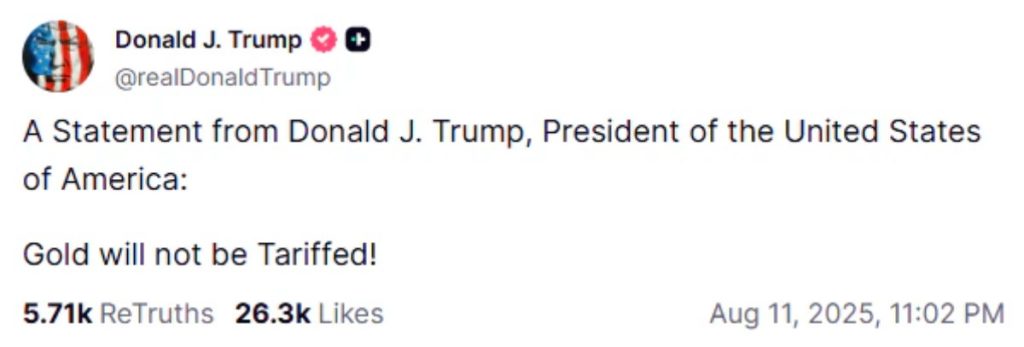 ‘द वॉल स्ट्रीट जनरल’ की एक रिपोर्ट के मुताबिक ट्रंप ने कहा कि गोल्ड पर किसी तरह का टैरिफ नहीं लगेगा। इससे पहले कस्टम और सीमा सुरक्षा विभाग ने कहा था कि गोल्ड पर भारी टैक्स लग सकता है, लेकिन ट्रंप ने इस पर स्थिति स्पष्ट कर दी है। ट्रंप ने यह घोषणा उस वक्त की है जब भारत और रूस के साथ उसकी तनातनी चल रही है. ट्रंप ने भारत पर 50 प्रतिशत टैरिफ लगाया है।