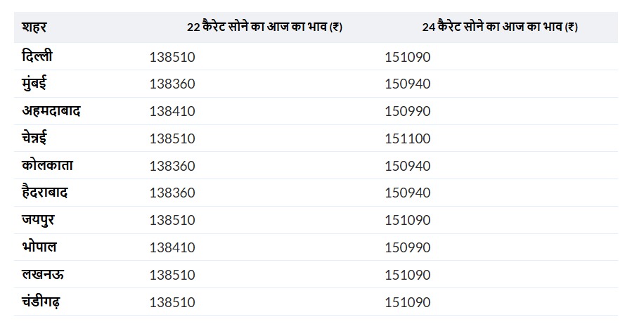 • दिल्ली में सोने का भाव: दिल्ली में, 24 कैरेट सोने का भाव 151,090 प्रति 10 ग्राम है, जबकि 22 कैरेट सोने की दर 138,510 प्रति 10 ग्राम है.