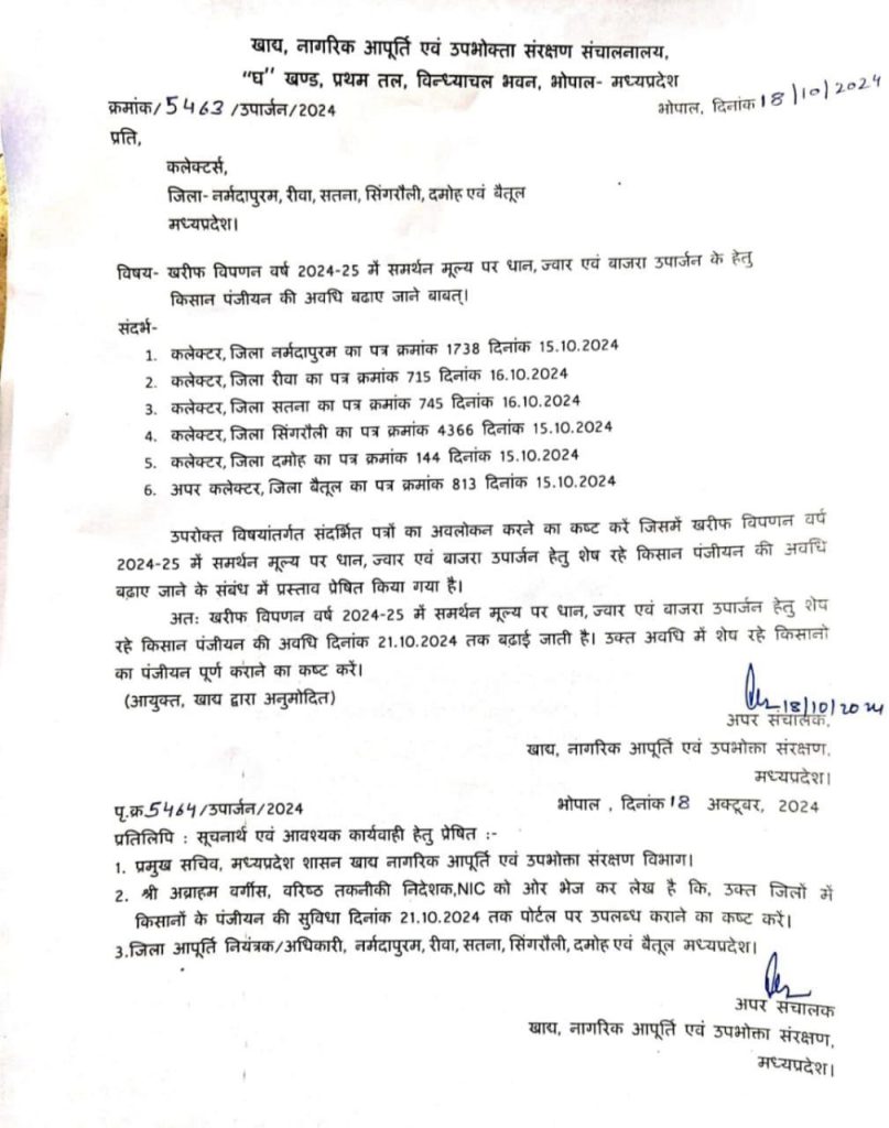शिखिल ब्यौहार, भोपाल। मध्य प्रदेश में किसानों के लिए एक अच्छी खबर सामने आई है। प्रदेश के 6 जिलों में समर्थन मूल्य पर खरीफ फसलें बेचने के रजिस्ट्रेशन की तारीख बढ़ा दी गई है। नर्मदापुरम, रीवा, सतना, सिंगरौली, दमोह और बैतूल में तारीख बढ़ी है। अब इन जिलों के किसान 21 अक्टूबर तक फसल बेचने के लिए रजिस्ट्रेशन करा सकेंगे। पंजीयन की तारीख बढ़ाने को लेकर आदेश जारी कर दिया गया है।