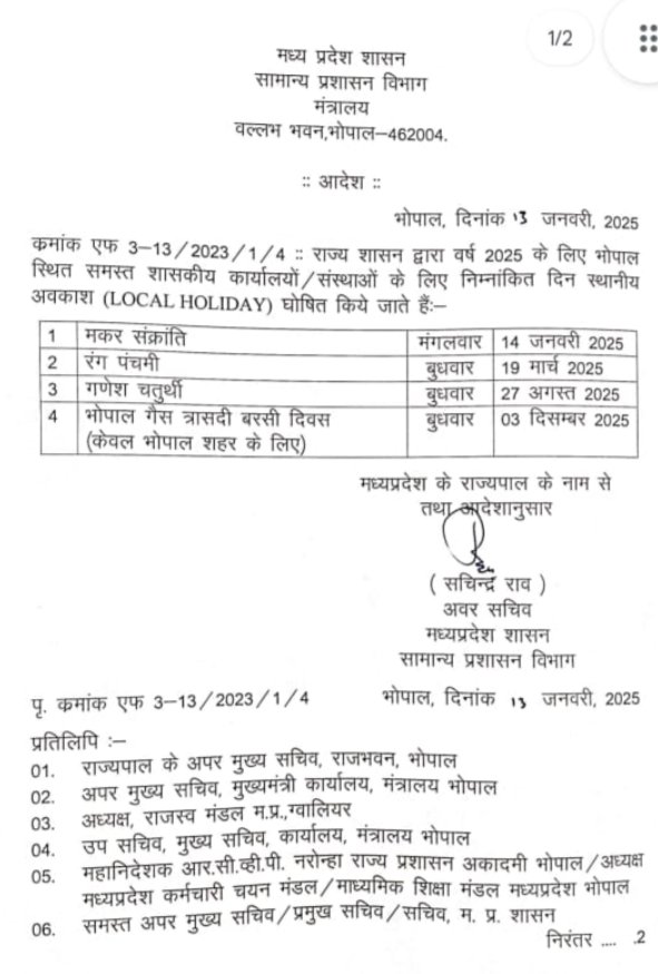 भोपाल जिला प्रशासन ने मकर संक्रांति के साथ साथ रंगपंचमी पर 19 मार्च, गणेश चतुर्थी 27 अगस्त और भोपाल गैस त्रासदी की वर्षी 3 दिसंबर 2025 को स्थानीय अवकाश की घोषणा की गई है। इसके साथ ही इंदौर मे अहिल्या उत्सव पर 22 अगस्त को (आधा दिन) का अवकाश रहेगा। जिसको लेकर आदेश भी जारी कर दिया गया है।