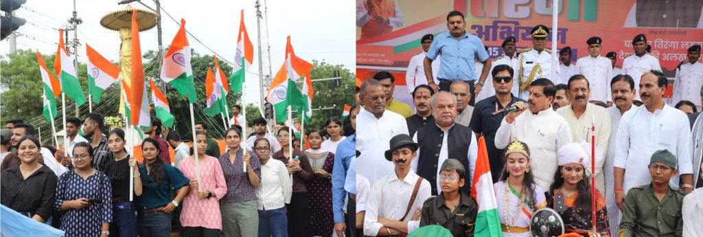 कर्ण मिश्रा, ग्वालियर। प्रधानमंत्री नरेंद्र मोदी के आह्वान पर देशभर में तिरंगा यात्रा निकाली जा रही हैं। हर घर तिरंगा अभियान के तहत ग्वालियर में भी आज तिरंगा यात्रा निकाली गयी। जिसमें मध्य प्रदेश के मुख्यमंत्री डॉ मोहन यादव शामिल हुए। यात्रा में शामिल होने से पहले सीएम ने राष्ट्र नायकों की वेषभूषा में मौजूद नन्हे बच्चों से मुलाकात की। इसके बाद सीएम विशेष रथ पर सवार होकर राजमाता तिराहा से तिरंगा यात्रा की अगुवाई करते नजर आए।