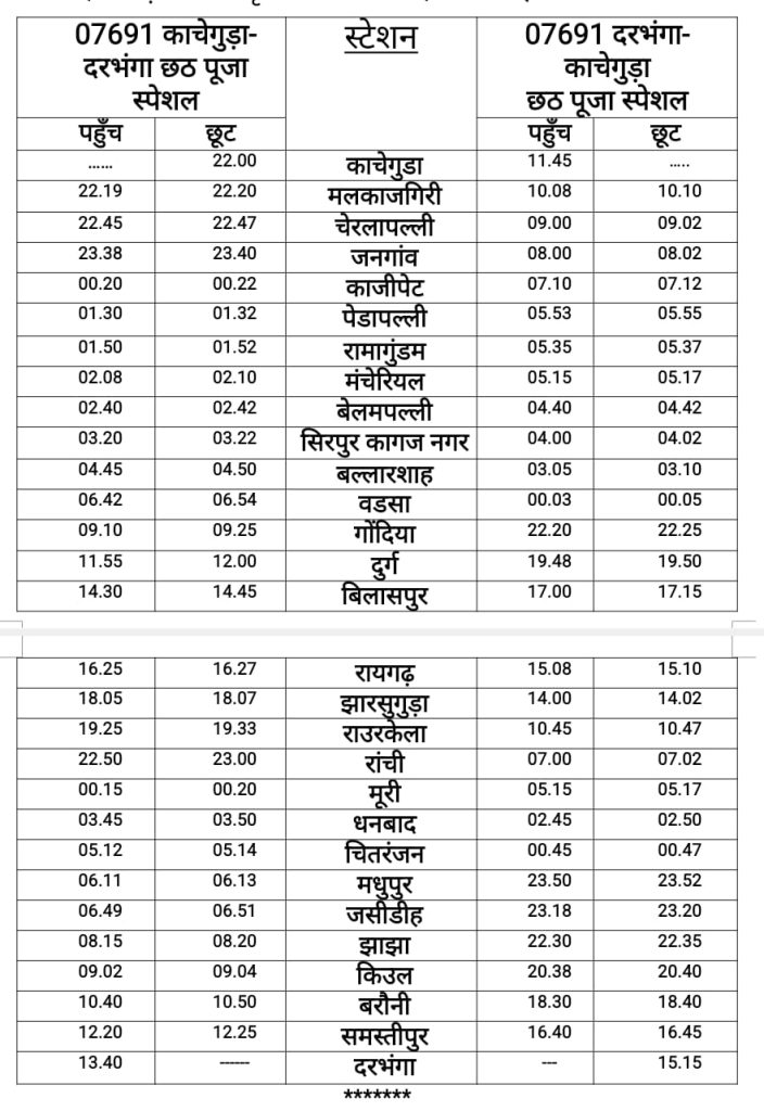 यह ट्रेन काचीगुडा से दरभंगा के लिए 07691 नंबर के साथ दिनांक 03 एवं 10 नवंबर 2024 को रवाना होगी . यह गाड़ी काचीगुडा से 22.00 बजे रवाना होकर अन्य स्टेशनों से होते हुए दूसरे दिन दक्षिण पूर्व मध्य रेलवे के ठहराव वाले गोंदिया स्टेशन 09.10 बजे, दुर्ग 11.55 बजे, बिलासपुर 14.30 बजे, रायगढ़ 16.25 बजे तथा तीसरे दिन 13.40 बजे दरभंगा पहुंचेगी.