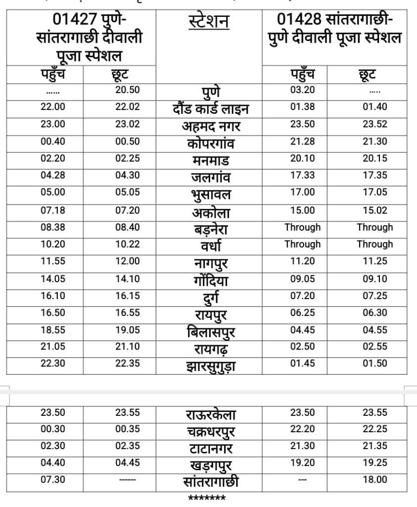 यह ट्रेन पुणे से सांतरागाछी के लिए 01427 नंबर के साथ 30 अक्टूबर 2024 को रवाना होगी. यह गाड़ी पुणे से 20.50 बजे रवाना होकरअन्य स्टेशनों से होते हुए दूसरे दिन दक्षिण पूर्व मध्य रेलवे के ठहराव वाले गोंदिया स्टेशन 14.05 बजे दुर्ग 16.10 बजे, रायपुर 16.50 बजे, बिलासपुर 18.55 बजे, रायगढ़ 21.05 बजे तथा तीसरे दिन 07.30 बजे सांतरागाछी पहुंचेगी.