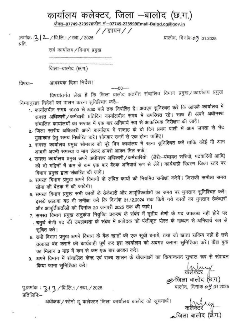 लक्ष्मीकांत बंसोड़, बालोद। कलेक्टर ने जिले की जनता और कार्यालयों के कामकाज में कसावट के लिए अधीनस्थ अधिकारियों के लिए दिशा-निर्देश जारी किया है. इसमें समय पर कार्यालय में उपस्थित होने से लेकर सप्ताह में दो दिन आम जनता से भेंट-मुलाकात करने सहित 9 अलग-अलग बिंदु शामिल हैं. यह भी पढ़ें : बदहाल सड़क, परेशान जनता और विकास के खोखले दावे… देखें बलौदाबाजार जिले की तस्वीर…