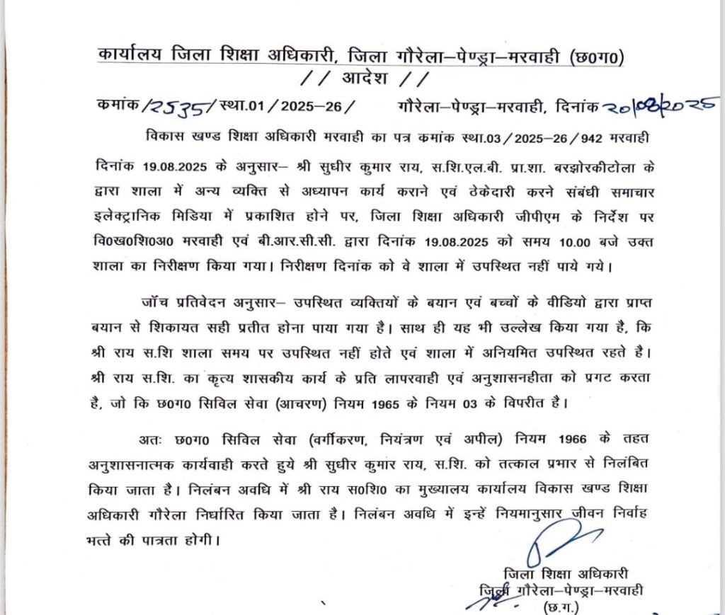 इस पर अनुशासनात्मक कार्रवाई करते हुए सहायक शिक्षक सुधीर कुमार राय को तत्काल प्रभार से निलंबित किया जाता है. निलंबन अवधि में सुधीर कुमार का मुख्यालय गौरेला विकास खण्ड शिक्षा अधिकारी कार्यालय निर्धारित किया गया है. निलंबन अवधि में उन्हें नियमानुसार जीवन निर्वाह भत्ते की पात्रता होगी.
