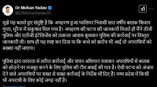 सीएम ने आगे कहा, “पुलिस द्वारा तत्परता से त्वरित कार्रवाई और सघन अभियान चलाकर अपराधियों से बालक को छोड़ने पर मजबूर करने के लिए पुलिस की टीम बधाई की पात्र है। ऐसी घटना को अंजाम देने वाले अपराधियों पर सख्त से सख्त कार्रवाई के निर्देश भी दिए हैं। मध्य प्रदेश में किसी भी अपराधी के लिए कोई जगह नहीं है।”