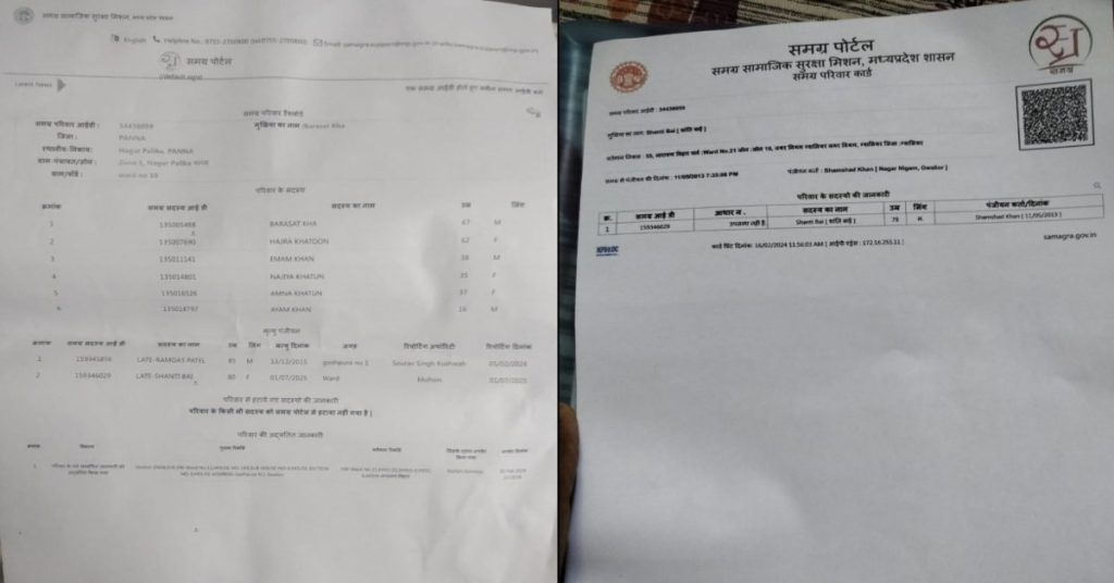 समग्र आईडी में बरसात के परिजन हजरा, इमाम, नाजिया, अमना, आयाम का नाम भी जोड़ दिए गए है। शासन से मिलने वाली योजनाओं का लाभ भी बरसात खान का परिवार लेने लगा है। इसी समग्र आईडी में शांति बाई पटेल को 1 जुलाई 2025 को मरा हुआ बताया गया। इसमें निगम के रिपोर्टिंग अथॉरिटी व्यक्ति मोहसिन का नाम भी दर्शाया गया। जिसकी आईडी से शांति बाई पटेल की मृत्यु की तारीख दर्ज कर उनकी समग्र आईडी खत्म कर दी गई। जिसके कारण उन्हें मिलने वाला राशन और वृद्धावस्था पेंशन भी बंद हो गई।