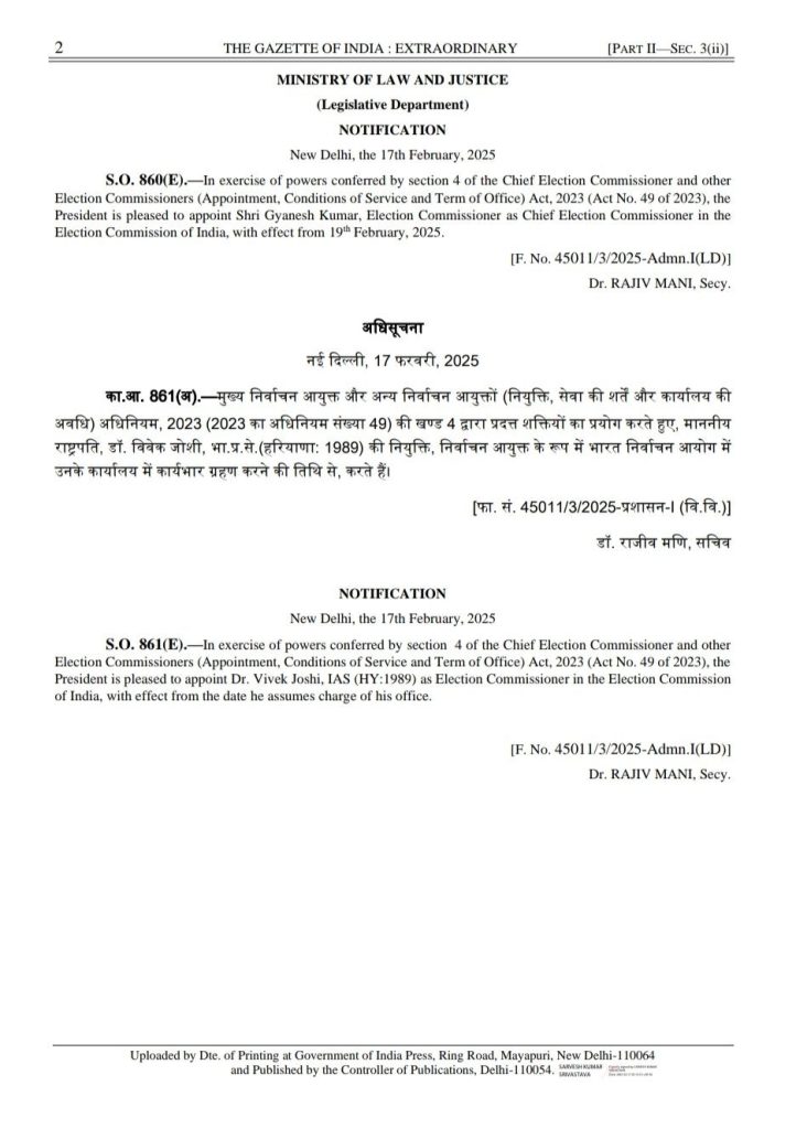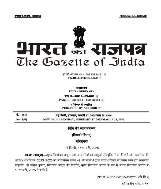 नई दिल्ली। देश के नए मुख्य चुनाव आयुक्त आईएएस अधिकारी ज्ञानेश कुमार होंगे. केंद्र सरकार ने इस संबंध में अधिसूचना जारी कर दी है. इससे पहले सोमवार को पीएमओ में चयन समिति की बैठक हुई थी. इसमें पीएम मोदी, अमित शाह और लोकसभा में नेता प्रतिपक्ष राहुल गांधी शामिल हुए थे. ज्ञानेश कुमार मौजूदा सीईसी राजीव कुमार के रिटायरमेंट के बाद पदभार ग्रहण करेंगे. राजीव कुमार 18 फरवरी को रिटायर हो रहे हैं.