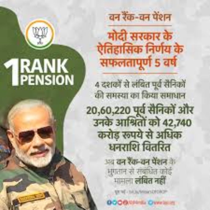 मोदी सरकार ने वन रैंक वन पेंशन को मंजूरी देकर पूर्व सैनिकों को बड़ी राहत दी. वन रैंक वन पेंशन (ओआरओपी) योजना के तहत, समान रैंक और समान अवधि की सेवा करने वाले सशस्त्र बलों के जवानों को एक जैसी पेंशन दी जाती है।