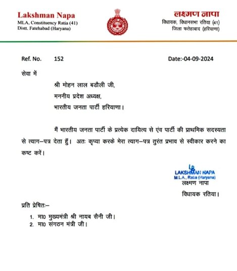 Haryana Assembly Election 2024: हरियाणा विधानसभा चुनाव के लिए बीजेपी (BJP) ने बुधवार (4 सितंबर) को कैंडिडेट की पहली लिस्ट (BJP Candidate List) जारी की। उम्मीदवारों की सूची जारी होते ही हरियाणा बीजेपी (Haryana BJP) में बवाल मच गया है। सूची जारी होने के 12 घंटे के अंदर ही विधायक समेत दो बड़े नेताओं ने पार्टी से इस्तीफा दे दिया है। टिकट न मिलने से नाराज फतेहाबाद के रतिया से विधायक लक्ष्मण नापा (Lakshman Napa) ने पार्टी से इस्तीफा दे दिया है। वहीं, हरियाणा बीजेपी किसान मोर्चा के प्रदेश अध्यक्ष सुखविंदर मांडी ने भी पार्टी छोड़ने का फैसला लेते हुए रिजाइन कर दिया है।