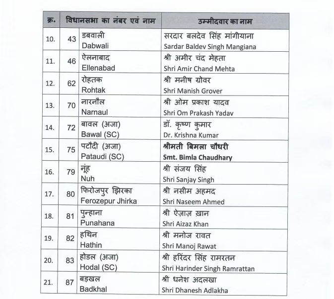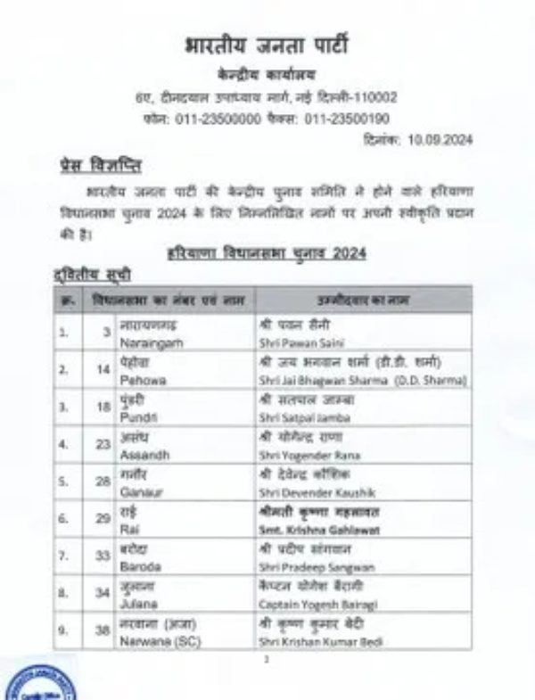 पार्टी ने नारायणगढ़ से पवन सैनी, पेहोवा से जय भगवान, पुंडरी से सतपाल जाम्बा, असंध से योगेंद्र राणा, गनौर से देवेंद्र कौशिक, राई से कृष्णा गहलावत, बरोदा से प्रदीप सांगवान, जुलाना से कैप्टन योगेश बेरागी, नरवाना से कुष्ण कुमार बेदी को टिकट दिया है। वहीं कुरुक्षेत्र के पिहोवा सीट पर बीजेपी ने उम्मीदवार बदल दिया है. बीजेपी ने पिहोवा सीट से अब जयभगवान शर्मा डीडी को उम्मीदवार बनाया है। आज ही पार्टी के पेहवा से पहले घोषित उम्मीदवार कंवलजीत अजराना ने टिकट वापस कर दिया था। अरजना ने चुनाव लड़ने से मना कर दिया है. रोहतक से पूर्व मंत्री मनीष ग्रोवर को मैदान में उतारा गया है।