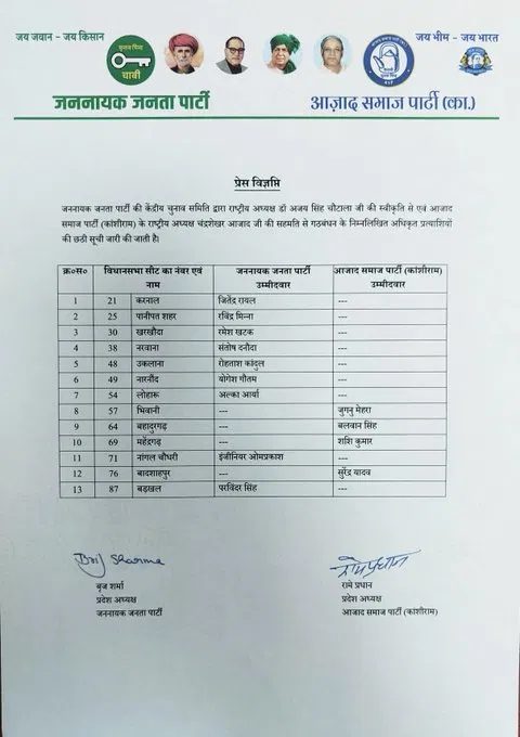 हरियाणा विधानसभा चुनाव के लिए जननायक जनता पार्टी (JJP) और आजाद समाज पार्टी (काशी राम) ने 13 उम्मीदवारों की एक और लिस्ट जारी की है।