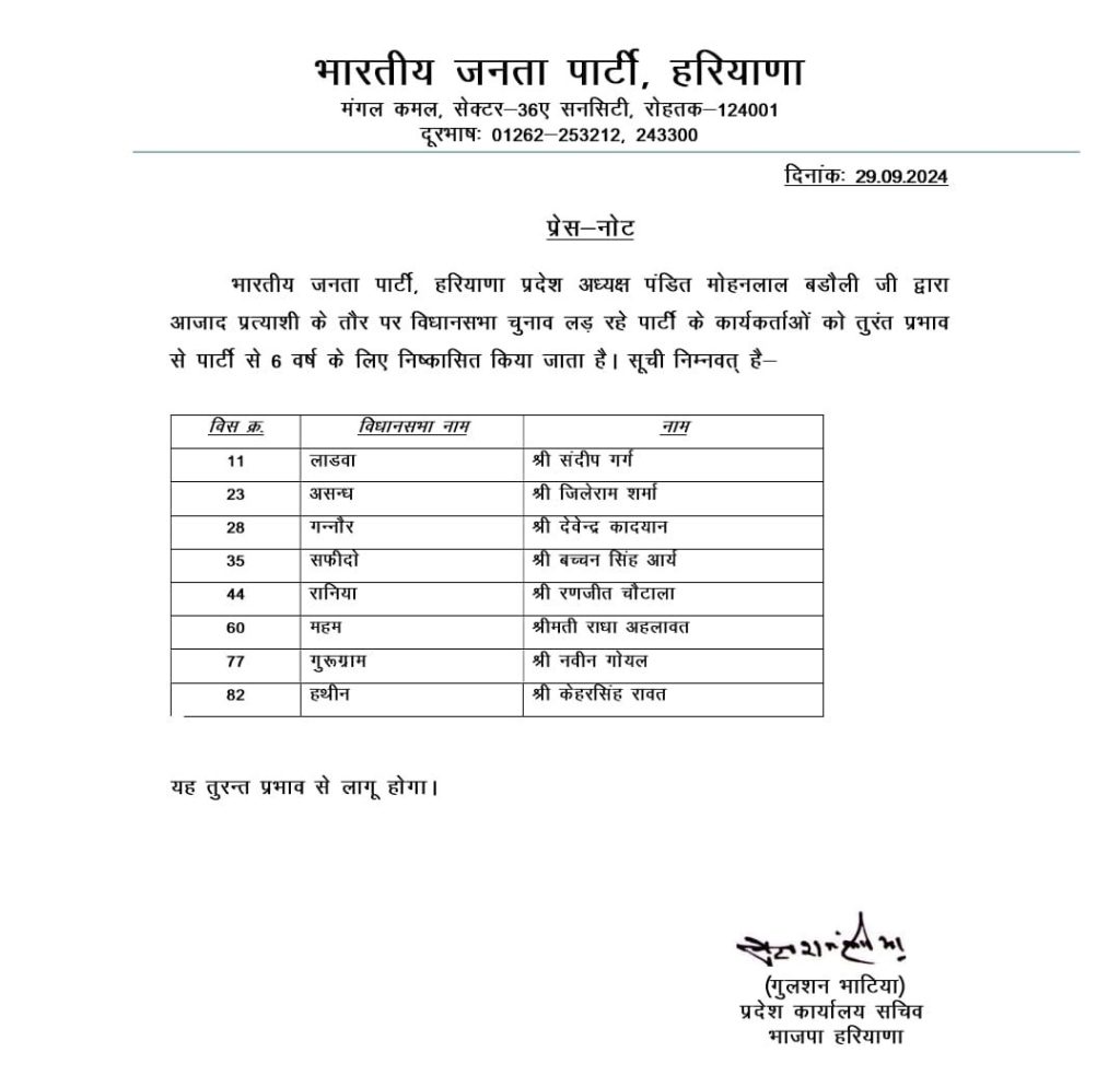 हरियाणा के प्रदेश अध्यक्ष मोहनलाल बडौली ने निर्दलीय प्रत्याशी के तौर पर विधानसभा चुनाव लड़ रहे पार्टी के कार्यकर्ताओं को तुरंत प्रभाव से पार्टी से छह वर्ष के लिए निष्कासित कर दिया है। भाजपा ने जिन्हें पार्टी से निकाला है उनमें वे नेता है जो लाडवा, असंध, गन्नौर, सफीदो, रानिया, महम, गुरुग्राम और हथीन से पार्टी प्रत्याशी के खिलाफ निर्दलीय चुनाव लड़ रहे हैं।